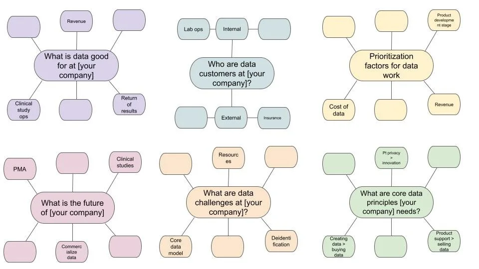 Map current and future revenue sources. I recommend creating a spider map to identify key themes. Here’s an example of some questions and options to map out. These will help start to make associations between data strategy and business needs. This is especially helpful for startups where the business roadmap is still nascent and may not be obvious to teams on the ground.