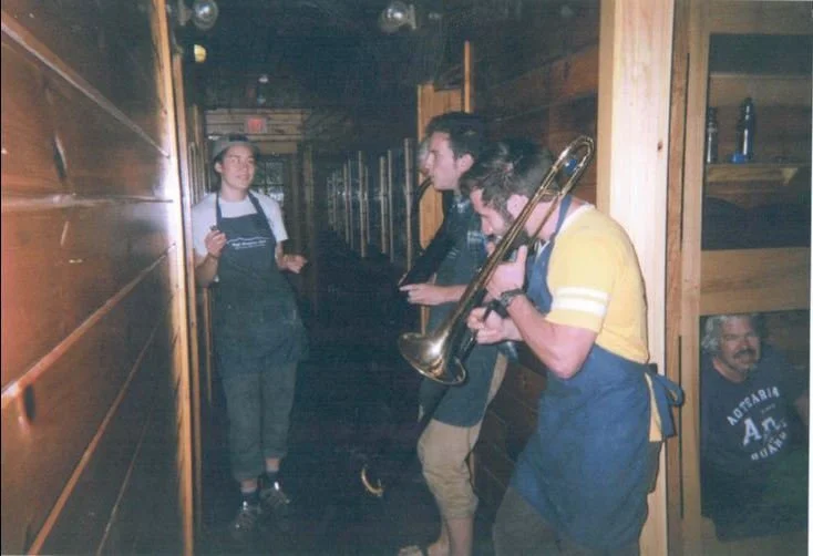 My croo at Mizpah Spring Hut waking up guests with a song. Notice how happy the guest on the bottom bunk (bottom right) is to be woken up with singing, a trombone and a melodica.